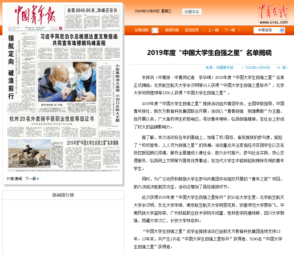 12月9日,由共青团中央、全国学联指导,中国青年报社、新东方教育科技集团联合开展的2019年度“中国大学生自强之星”奖学金评定活动名单揭晓。我校食品科学与工程学院2017级食品科学与工程专业杨宇、化工学院2016级能源化学工程专业田静卓两位同学荣获2019年度“中国大学生自强之星”奖学金。