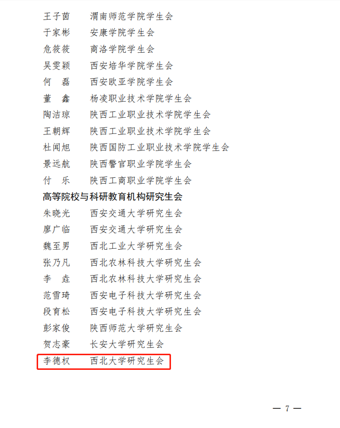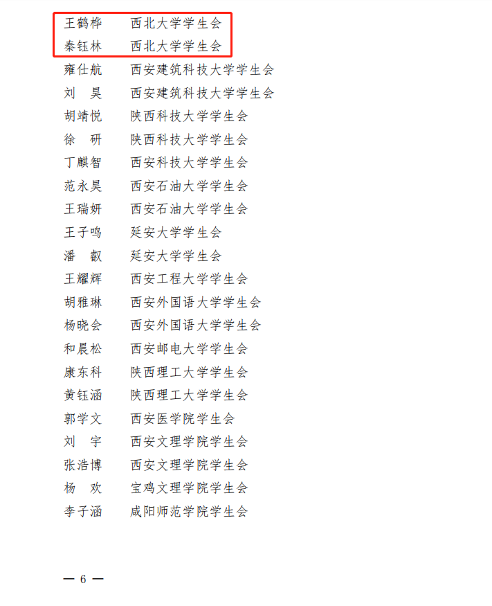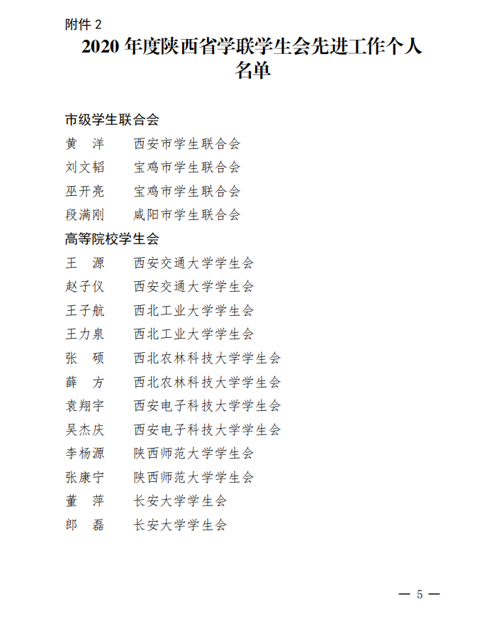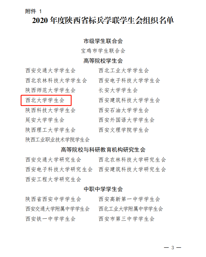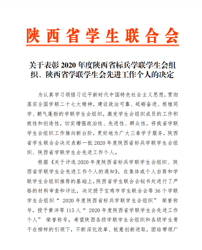 我校学生会获得“2020年度陕西省标兵学联学生会组织”荣誉称号;2017级汉语言文学专业本科生、校学生会执行主席王鹤桦,2018级社会保障学专业硕士研究生、校研究生会执行主席李德权,2017级物联网工程专业本科生、省学联驻会执行主席秦钰林荣获“2020年度陕西省学联学生会先进工作个人”荣誉称号。