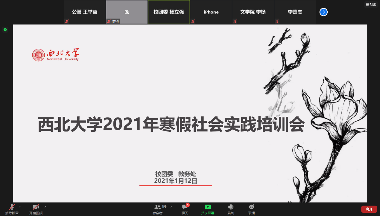 1月12日上午,“青春新征程 奋进‘十四五’”——2021年寒假社会实践培训会暨出征仪式于线上举行。本次会议由校团委文体与社会实践部部长杨立强主持,校团委宣传部部长朱梦鹤、校招生办公室潘超老师及各社会实践队成员等260余人参加。