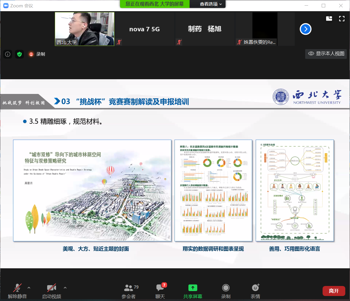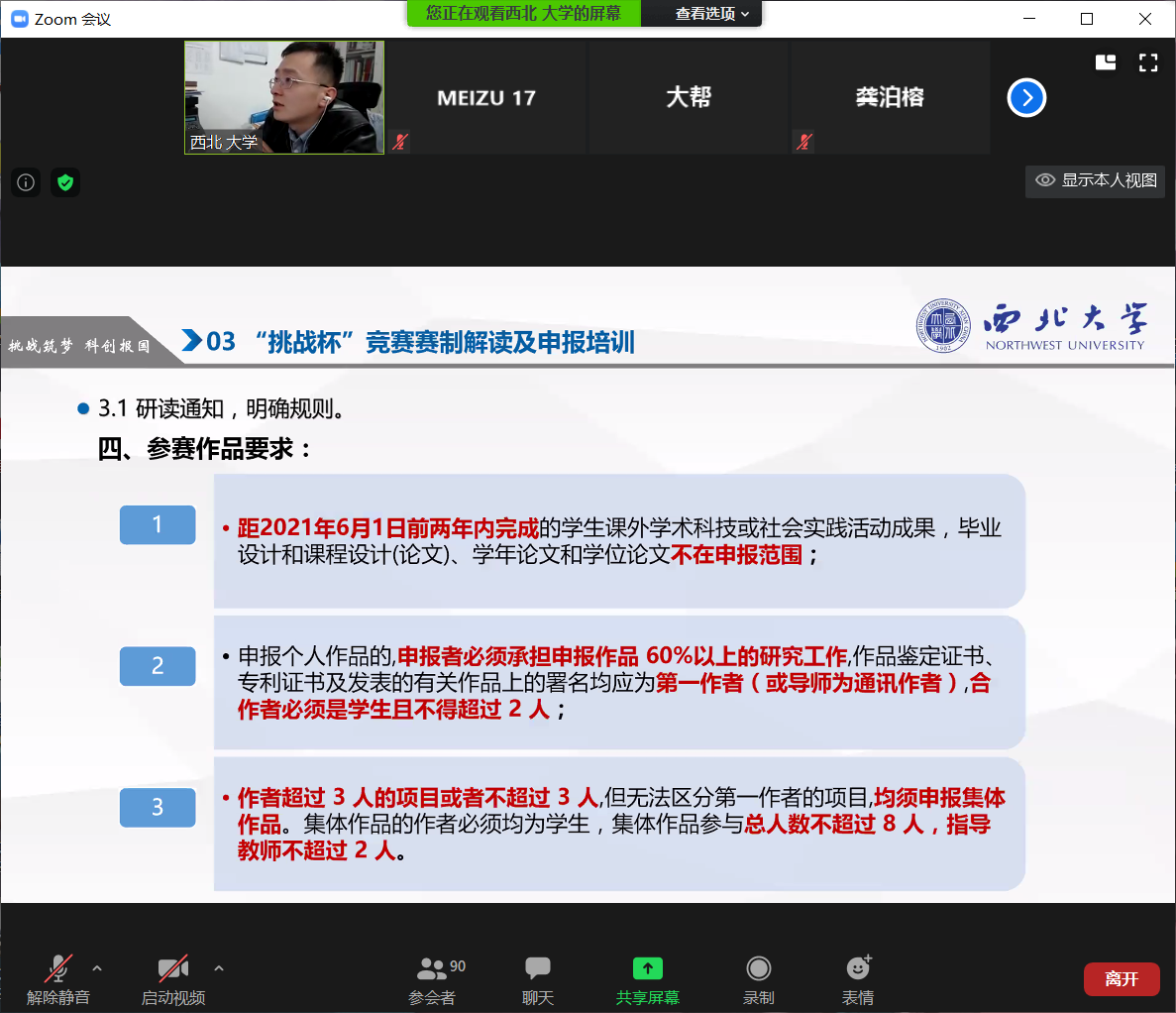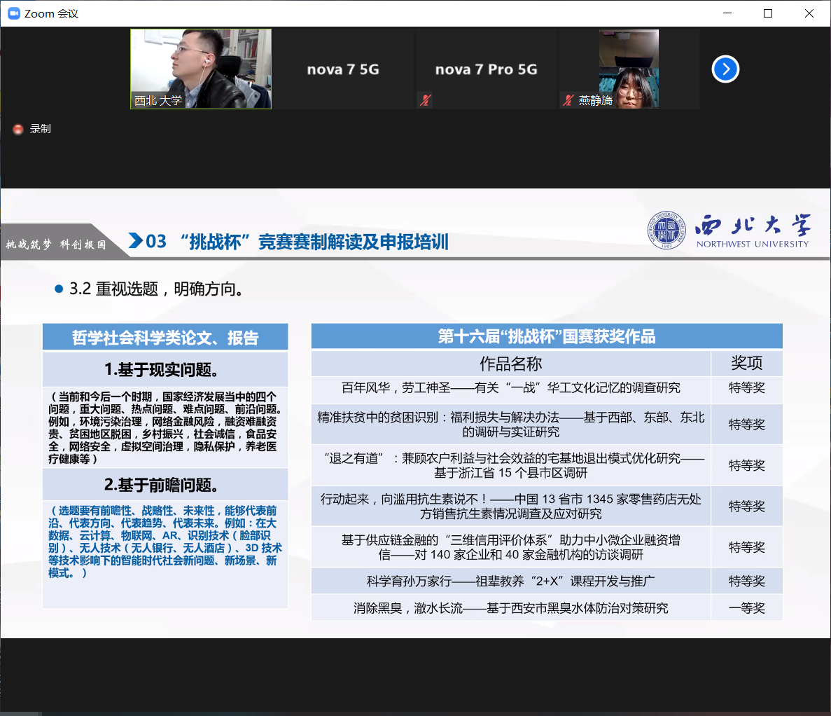 会上王伟老师针对本届“挑战杯”竞赛的内容和申报要求做了详细解读,并从作品选题、组建团队、实践研究、规范填写等方面进行了系统讲解。王伟老师还就往届竞赛中发现的细节问题、正反案例、评审要点等情况向大家进行展示和说明,让同学们对本届竞赛有了更加直观和清晰的认识。