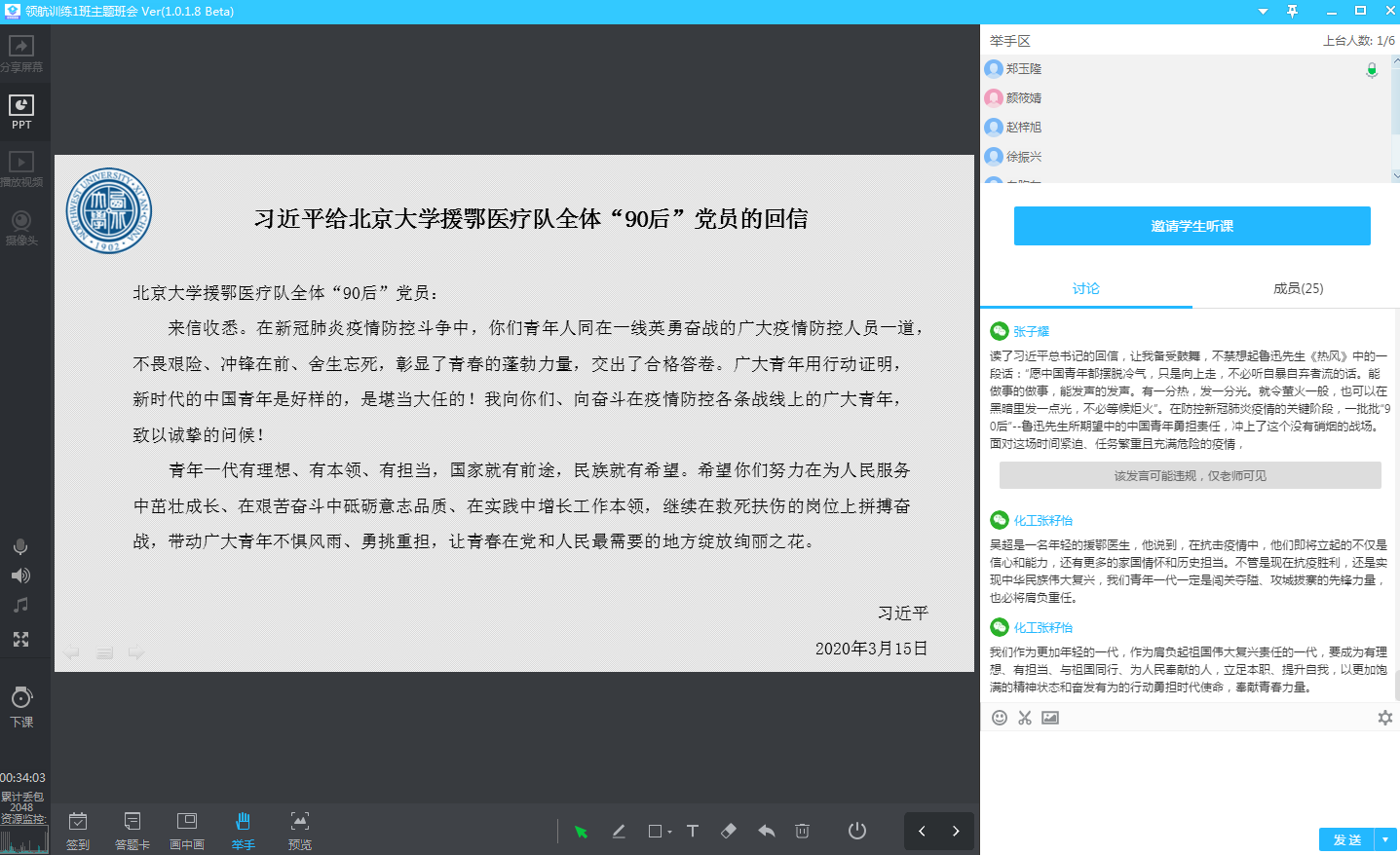 3月15日,习近平总书记给北京大学援鄂医疗队全体“90后”党员回信,勉励广大青年让青春在党和人民最需要的地方绽放绚丽之花,总书记的回信在全国青年中间引起了热烈反响。3月26日,校青马第十二期大学生骨干培训班领航训练1班利用线上平台,开展专题学习。