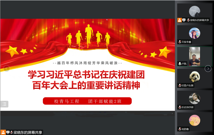 为了组织团员深入学习和贯彻习近平总书记在建团一百周年大会上的重要讲话精神,进一步了解共青团的发展历程,明确习近平总书记对青年人的寄托,树立成长目标。5月30日晚,团干部赋能2班全体同学齐聚云端,开展学习习近平总书记在庆祝建团百年大会上的重要讲话精神主题团日活动。本次活动由班主任卢凯主持。