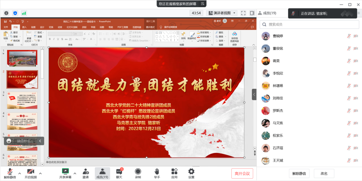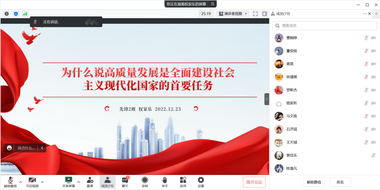 为深入学习贯彻党的二十大精神,强化讲座报告培训效能,扎实推进学员自主学习,2022年12月23日,校青马第十五期大骨班先锋2班于线上举办“学习二十大,奋进新征程”暨“‘青听’党的二十大”系列报告学习分享活动。