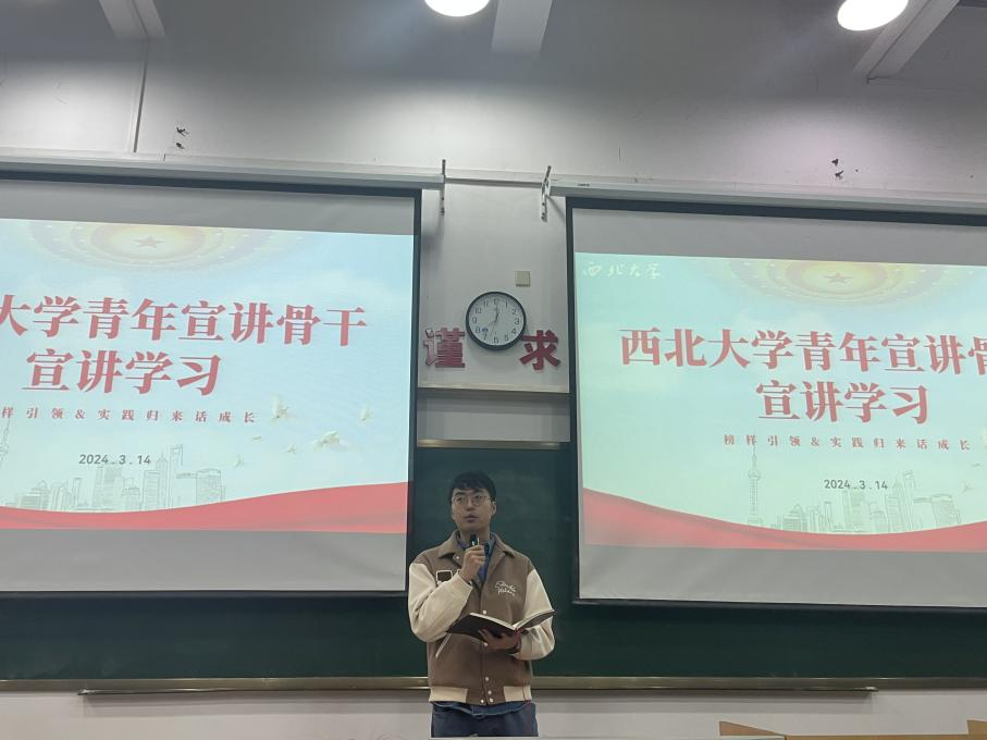 ”第十六期大学生骨干培训班志高1班于3号教学楼3J301教室召开西北大学青年宣讲骨干宣讲交流学习会。会议由班主任张得康老师主持,志高1班及城市与环境学院2023级本科生参加。