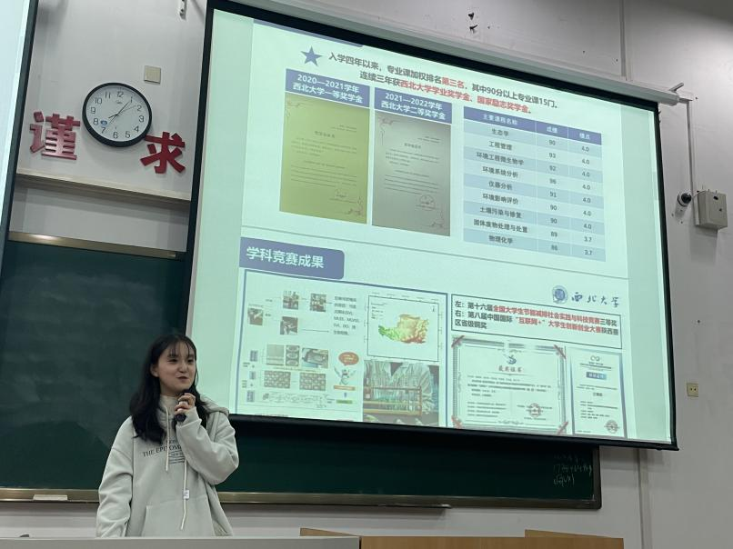 随后,二位同学分别进行宣讲。刘艺婷同学从学习科创、学生工作、兴趣爱好、志愿实践四个方面展开讲述自己在西大的成长之旅。在学习科创方面,她强调大家要扎实专业课程学习,积极参加“互联网+”“挑战杯”等创新创业竞赛;在学生工作方面,她简单讲述自己的工作成果,并鼓励大家投身学生工作,从实践中锻炼自己;在兴趣爱好方面,她建议大家勇于尝试,发现自己的闪光之处;在志愿实践方面,她着重讲述了自己参与研究生支教团的经历,呼吁大家作为新时代的新青年,不负大学美好时光,不负青春勇往向前的勇气,投身到祖国和人民最需要的地方。