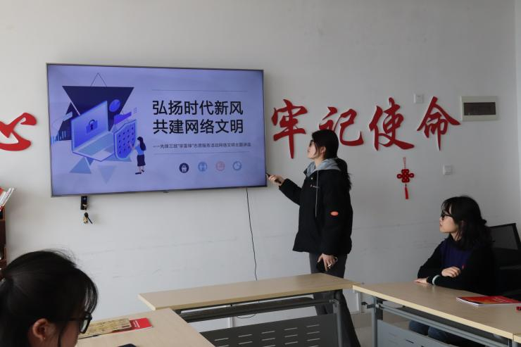 首先,胡雪晴、康语真两位同学以“弘扬时代新风,共建网络文明”为题为学员们进行讲座,从打造网络文明的意义、建设网络文明的做法出发,结合时事热点、真实案例让大家深刻认识到了文明上网的重要性,提高了文明上网的意识,自觉做到抵制网络暴力、营造清朗环境。之后,与会学员们一起朗读《遵守网络文明承诺书》并签名。