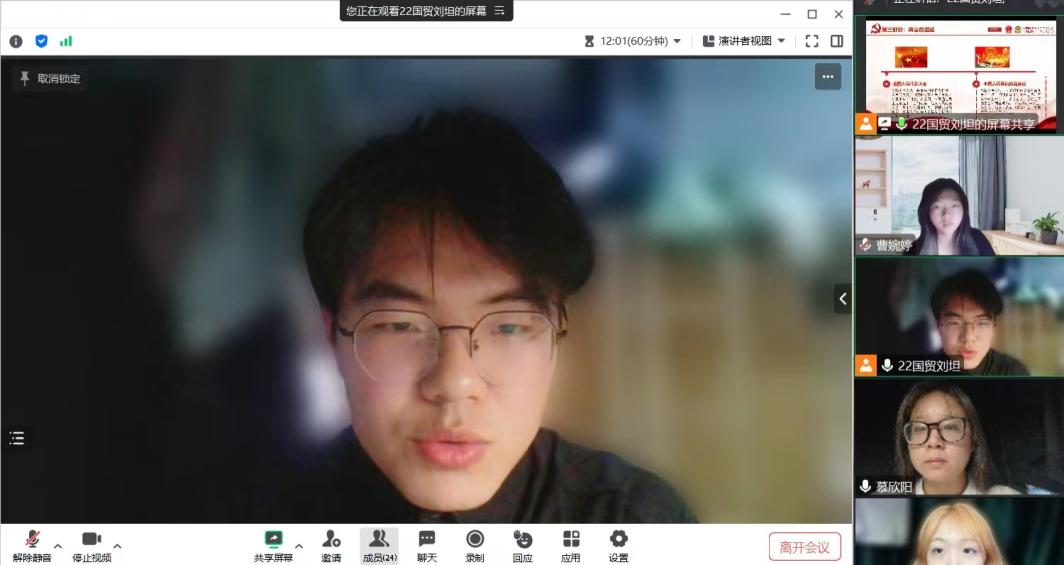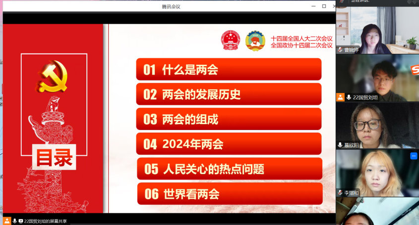 会上,刘坦同学首先向学员们介绍了什么是“两会”,随后又分别从“两会”的发展历史、“两会”的组成两方面向学员们深入普及“两会”知识。