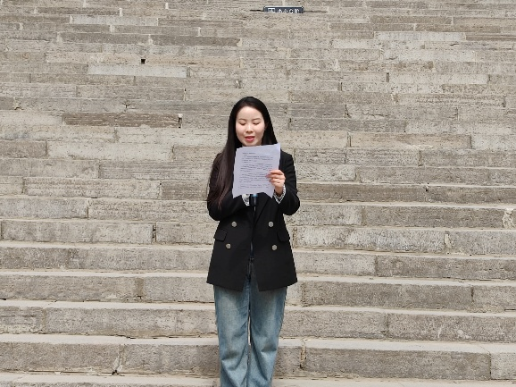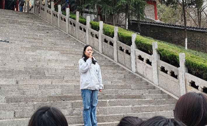 活动最后,学员代表耿天蓝交流感想。她表达了对杨虎城将军的崇敬之情,强调其为国家存亡、民族大义挺身而出的爱国将领形象,回顾了将军生平,并号召全体学员以杨虎城将军等革命先辈为榜样,坚定理想信念,锤炼过硬本领,在实现中华民族伟大复兴的新征程上贡献青春力量。她深情地说:“同学们,历史的车轮滚滚向前,但英雄的精神永远不会磨灭。让我们铭记杨虎城将军的不朽功绩,传承杨虎城将军的伟大精神。在新时代的征程中,我们要不忘初心,牢记使命,为建设社会主义现代化国家而努力奋斗!”铿锵有力的话语在陵园上空回荡,表达了当代青年继承先烈遗志、勇担时代使命的坚定决心。