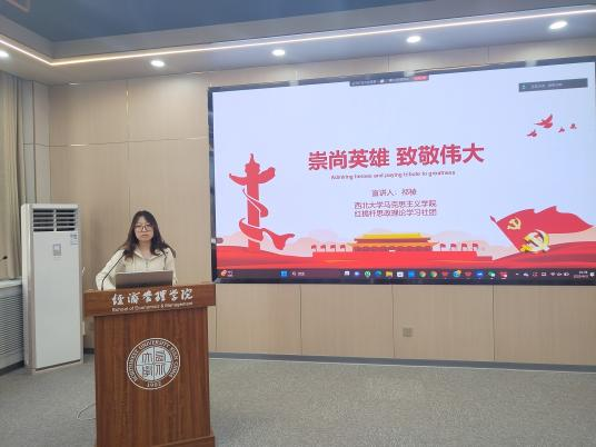 首先,西北大学马克思主义学院红桅杆思政理论学习社团祁祾同学为大家进行了“崇尚英雄 致敬伟大”的主题宣讲。祁祾同学结合习近平总书记关于学习英雄模范的重要论述回顾了社会主义革命建设改革时期的伟大英雄,让大家深刻理解英雄是民族的脊梁,在各时期发挥着关键作用。祁祾同学呼吁大家既要学习追求真理、爱国奉献的英雄精神,又要学习英雄朴实、忠诚、执着的优良品格,自觉传承英雄精神,为民族复兴贡献力量。