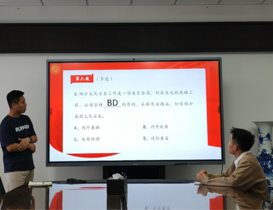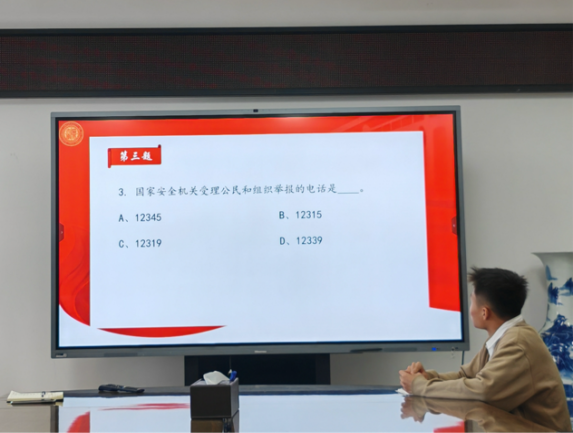 知识问答环节,学员们认真思考,积极抢答。内容涵盖《国家安全法》《反间谍法》等法律法规,以及生物安全、文化安全等新兴领域知识。“‘12339’是什么电话号码?”“发现危害国家安全行为应如何处理?”等贴近生活的问题,既检验了学习成效,又强化了“国家安全人人可为”的行动意识。